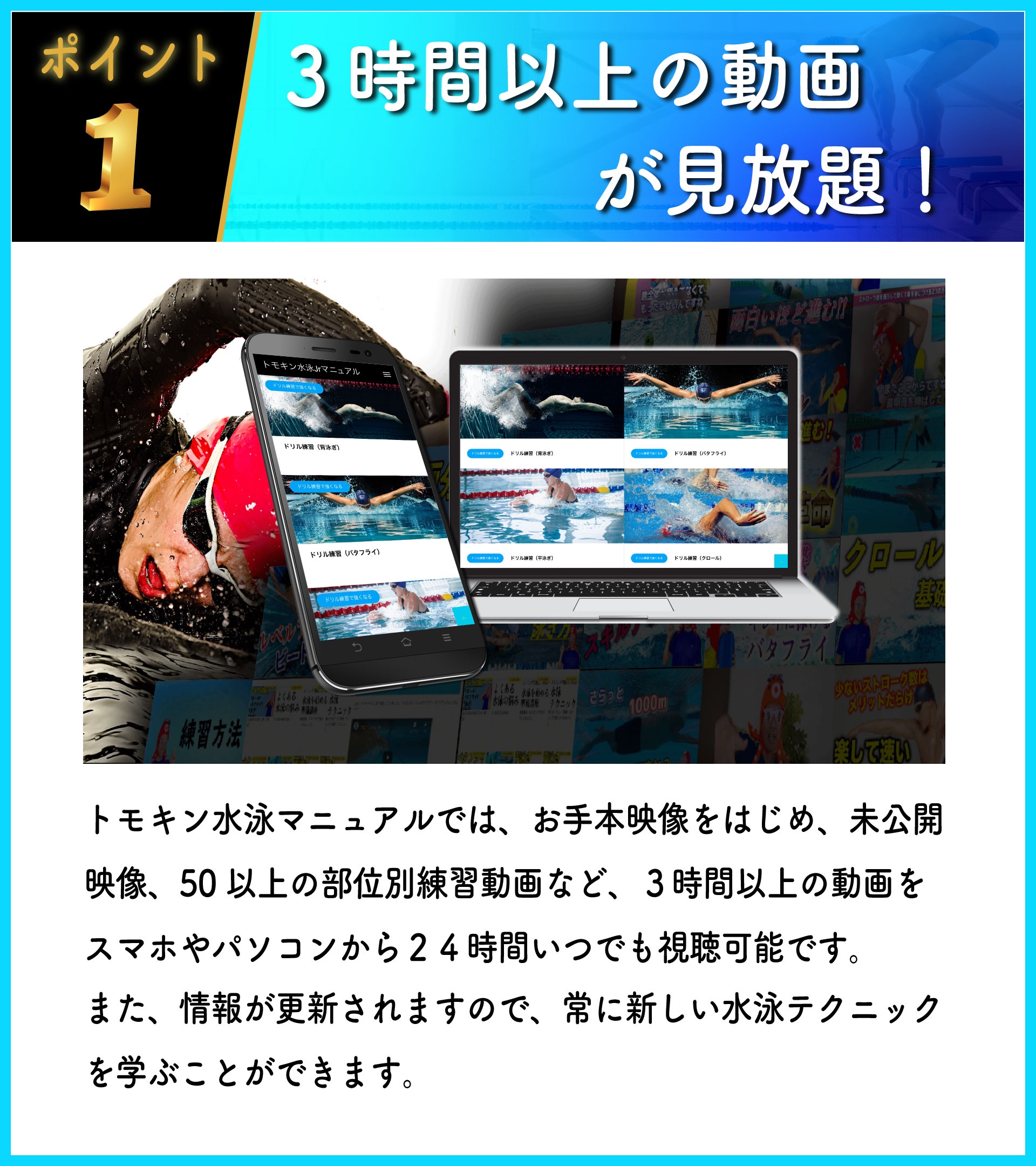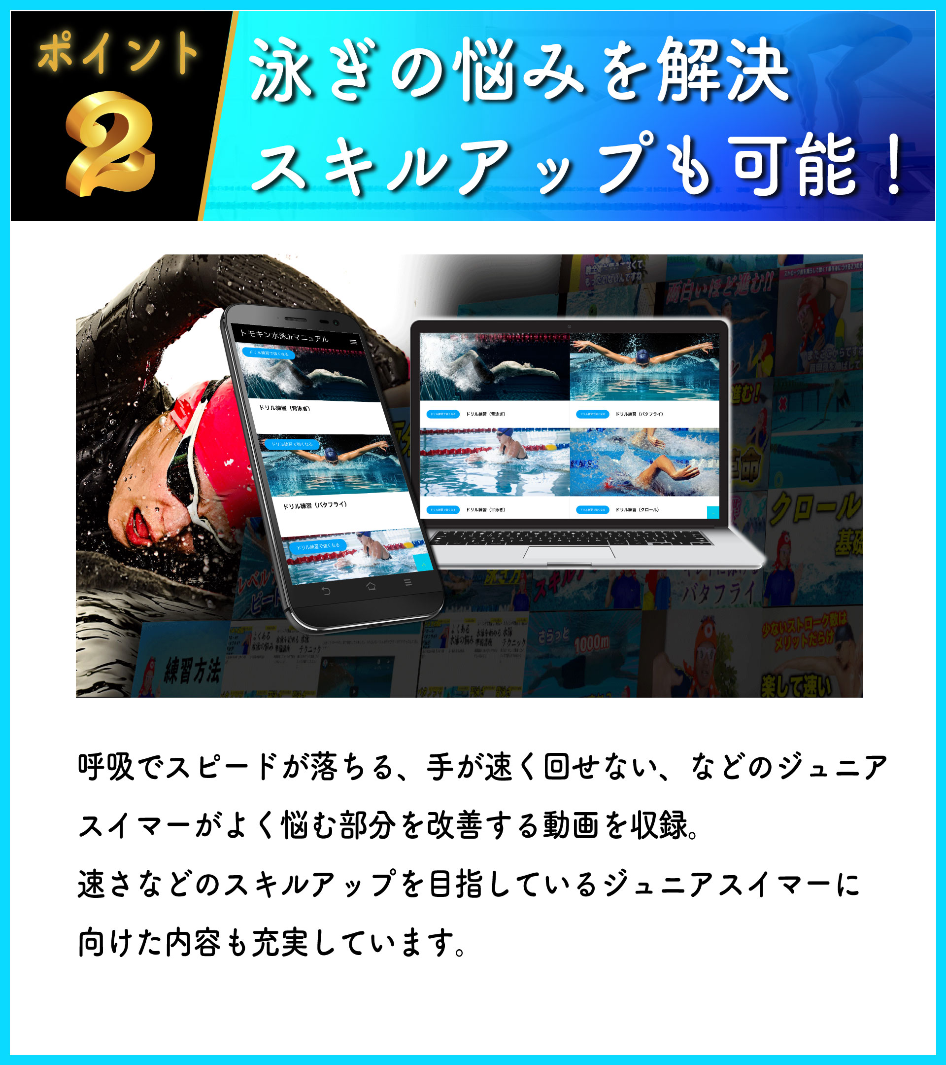 水泳ジュニアマニュアルでは、より実戦的で効果的な練習方法やジュニア向けにわかりやすい動画となっています。