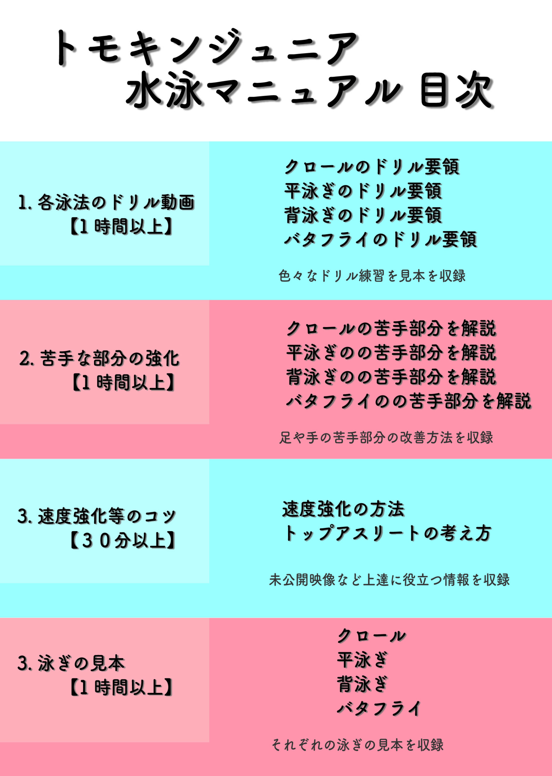 トモキン水泳ジュニアマニュアルでは、苦手部分を強化できるように具体的な練習方法が収録されています。