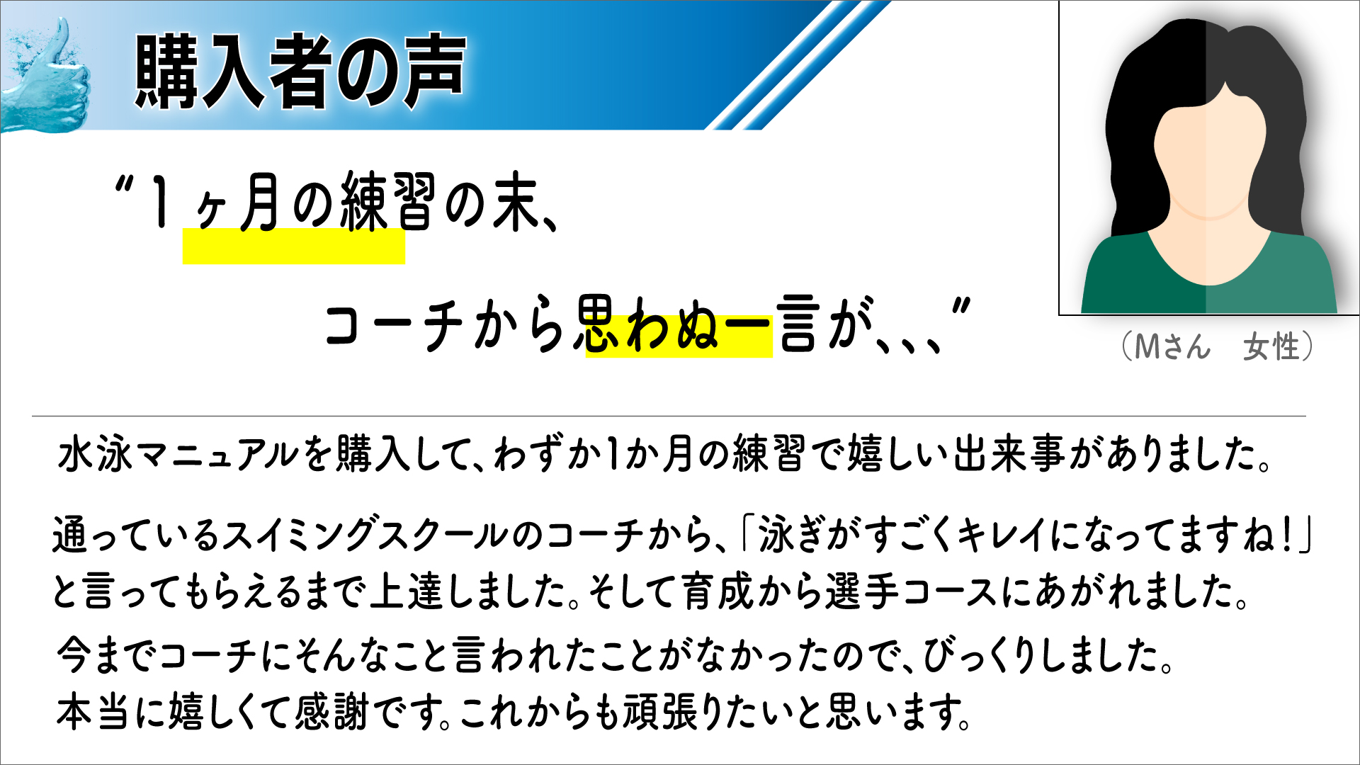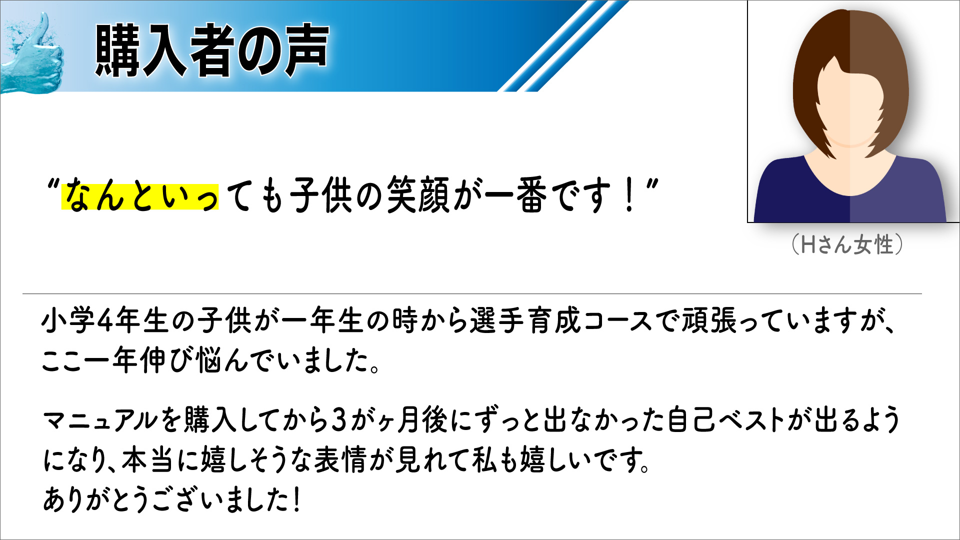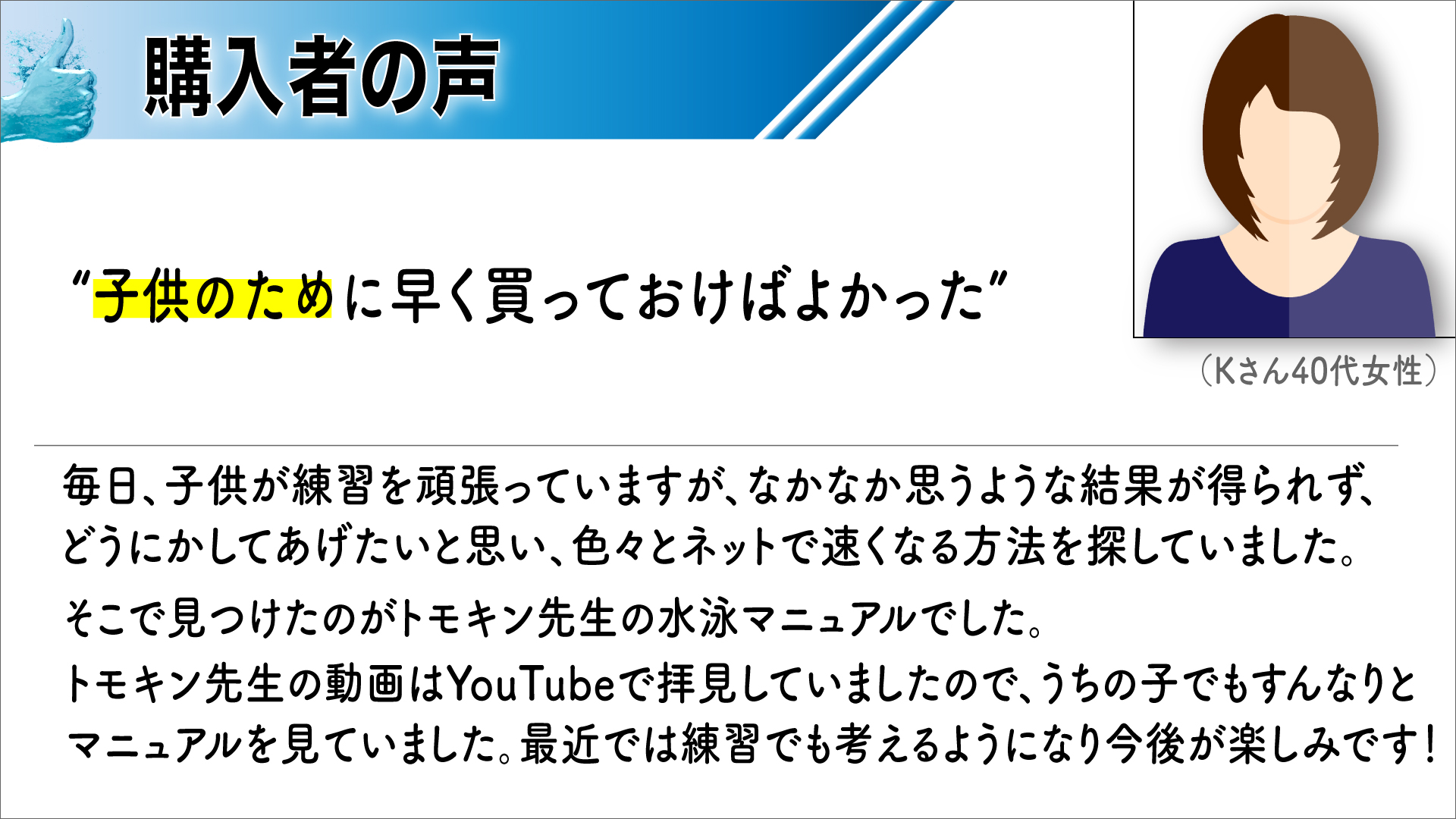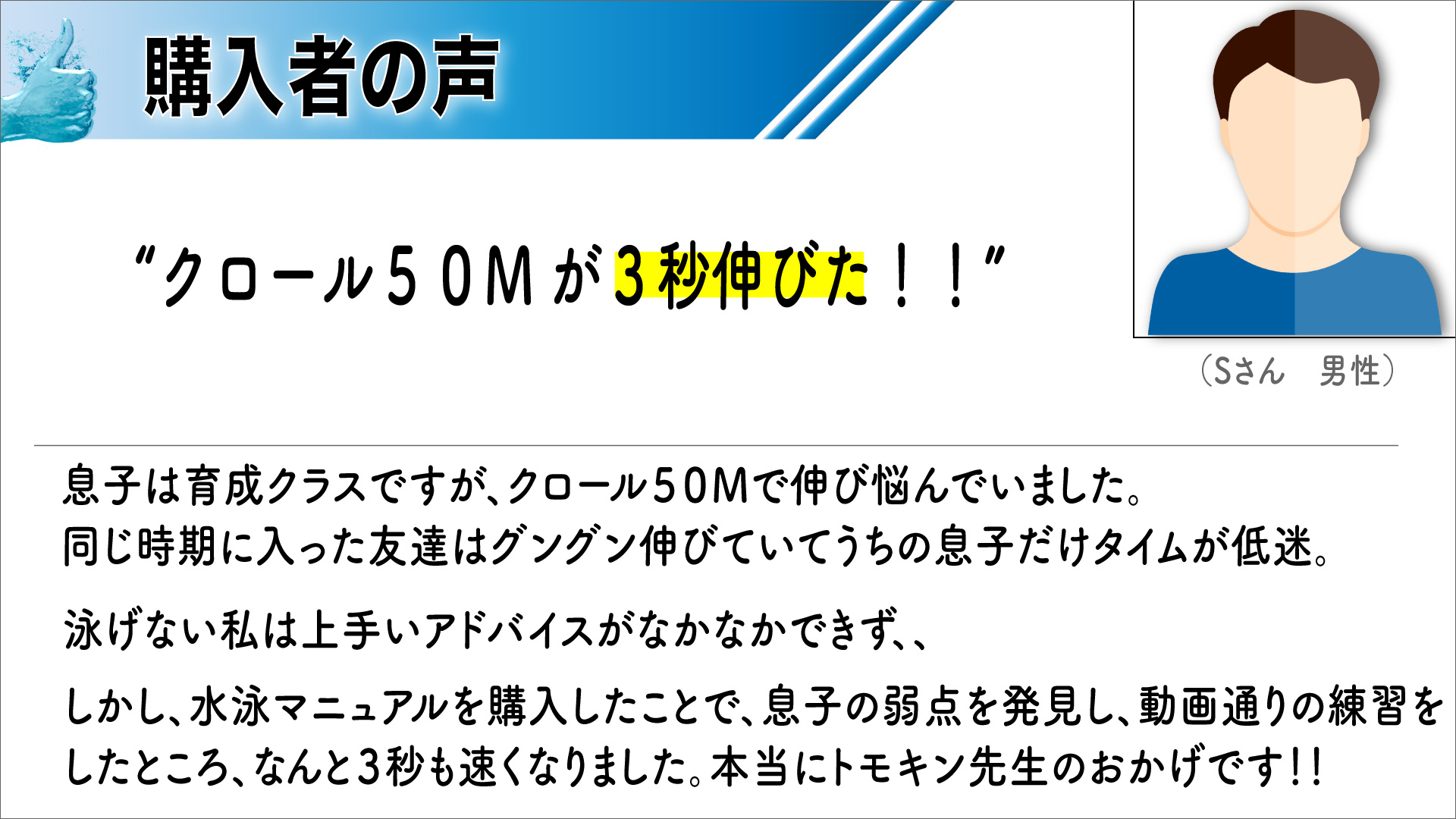 ですので、タイムを短期間で伸ばすことも可能です。また、購入者の方も結果が出ていますので、お子様の水泳上達に役立つようになっています。