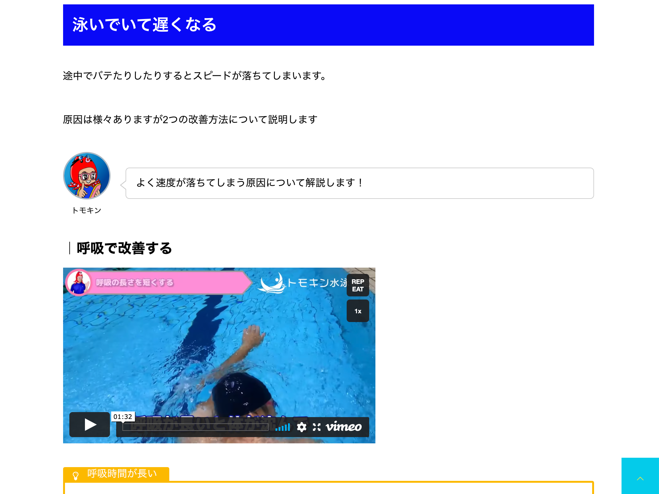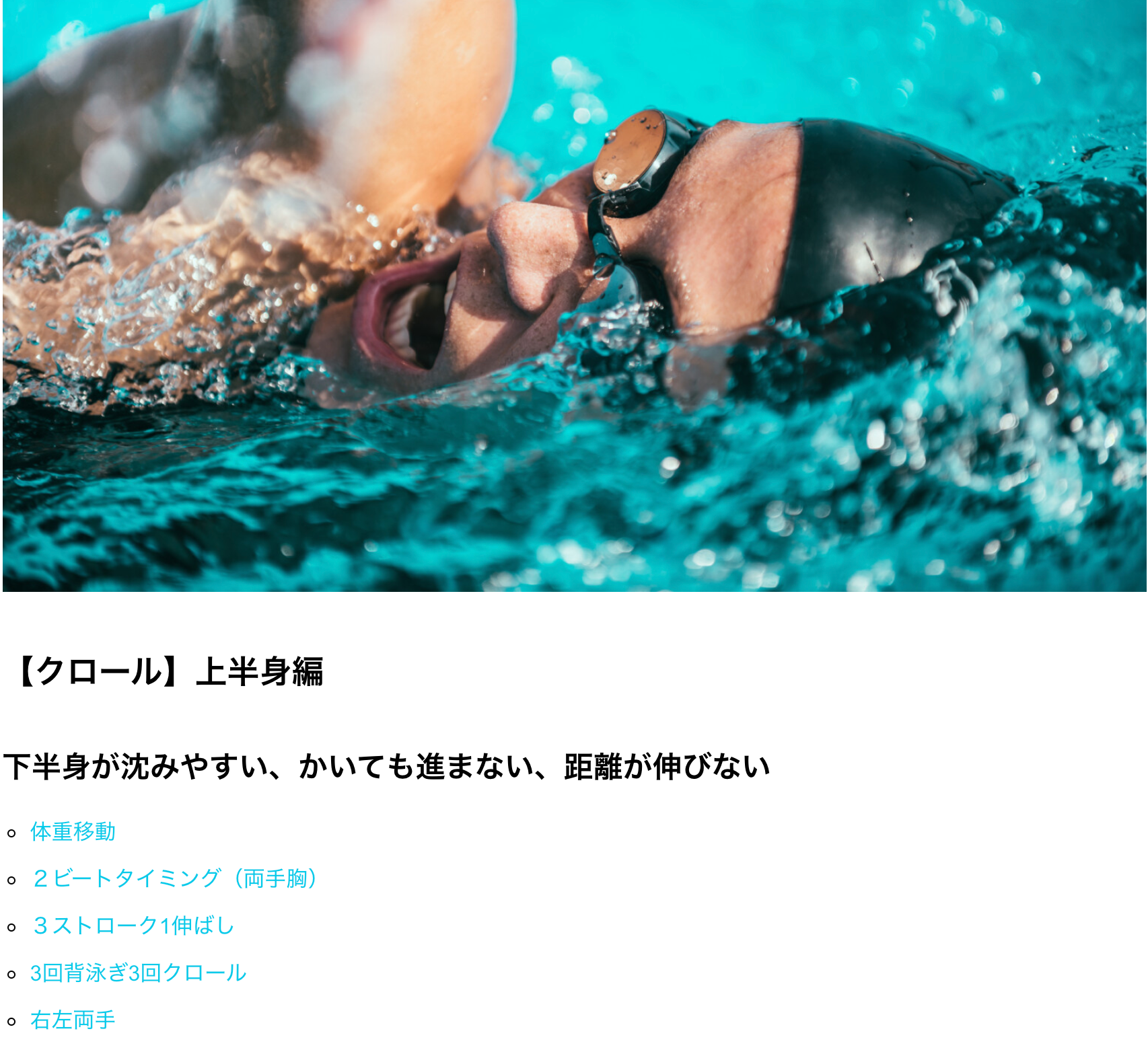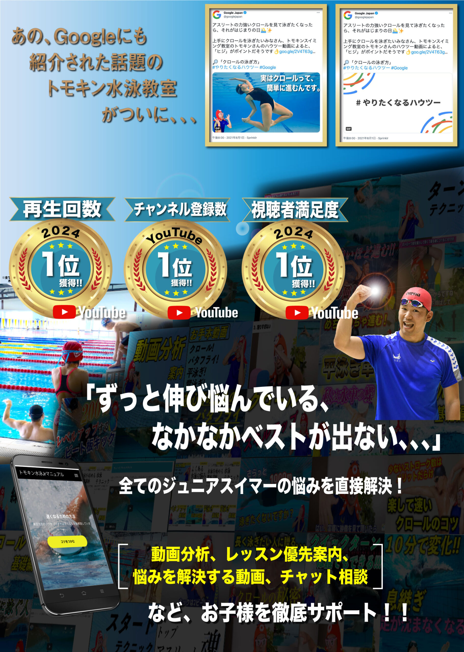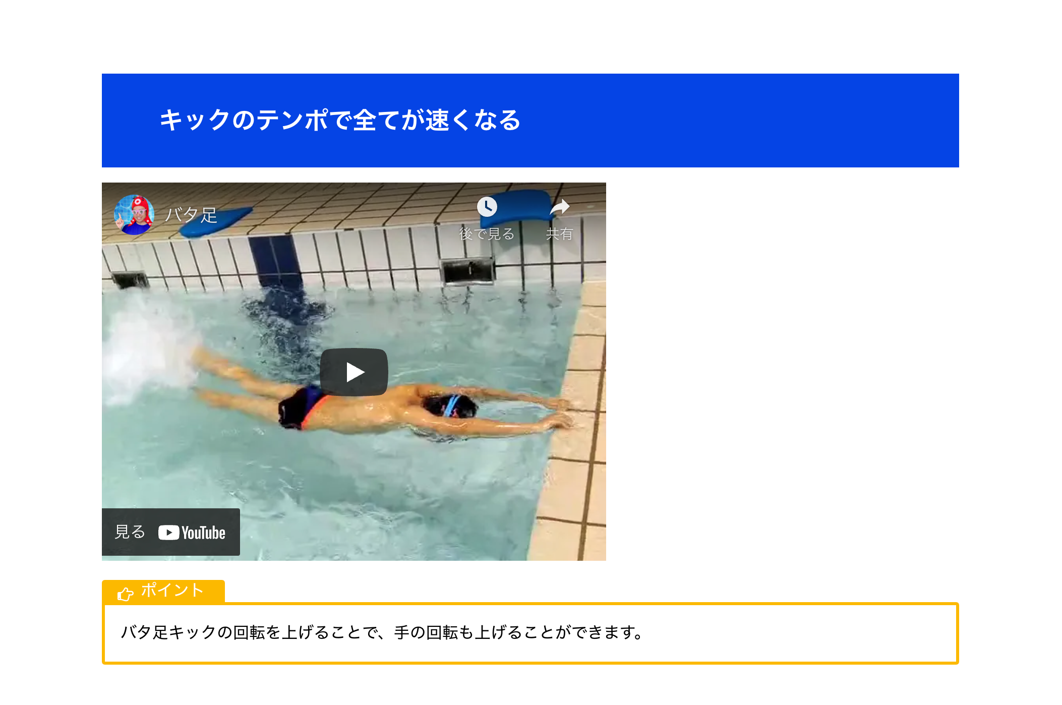 YouTubeで公開している無料レッスンは初心者向け、大人向け、ジュニアスイマーなどの情報が断片的であり、大きな違いがあります。